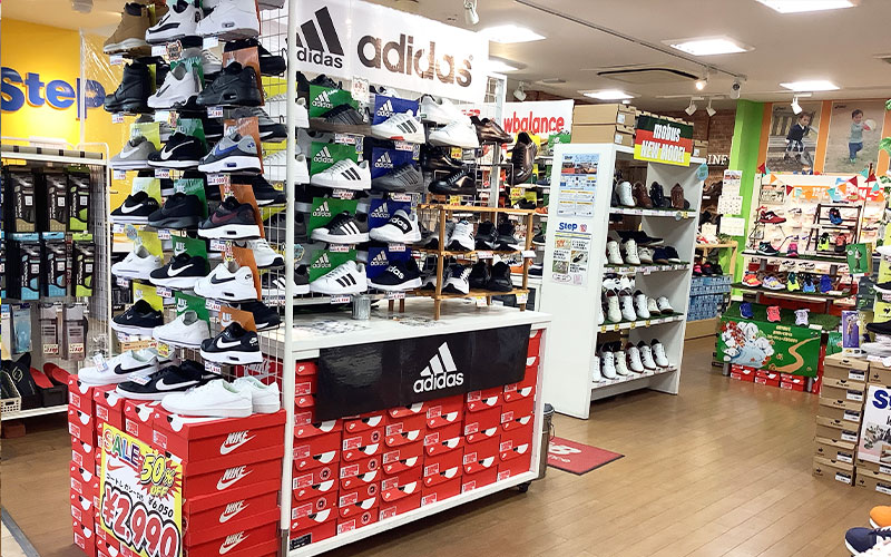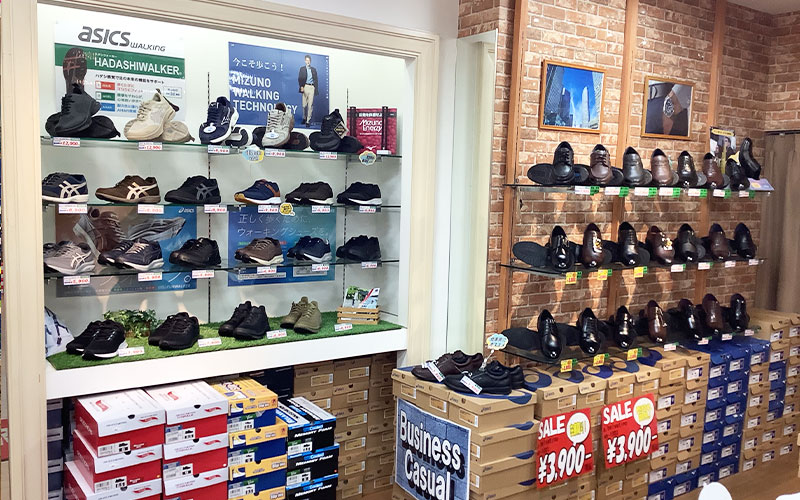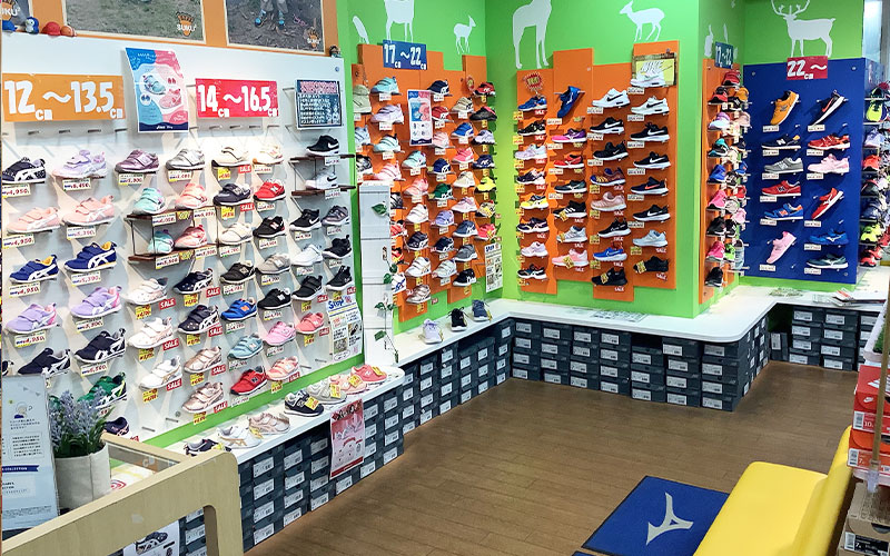 アディダス、ナイキ、ニューバランスなど大人気ブランド、日本を代表するアシックス、ミズノなどスポーツブランドも幅広く取り揃えています。またビジネスシューズ、ウォーキング、ランニングシューズもたくさんありお客様の生活にあったシューズ選びをサポート致します。ケア用品、インソールも充実させておりシューズが大好きで日々勉強に努めているスタッフがお客様の相談に乗らせていただきます。それに加えてキッズスペースがあるキッズコーナーでは専門のスタッフがお子様の足を計測させていただき、全力でシューズ選びをサポート致します。皆様のご用聞きを目指していますので是非、ご来店くださいませ。